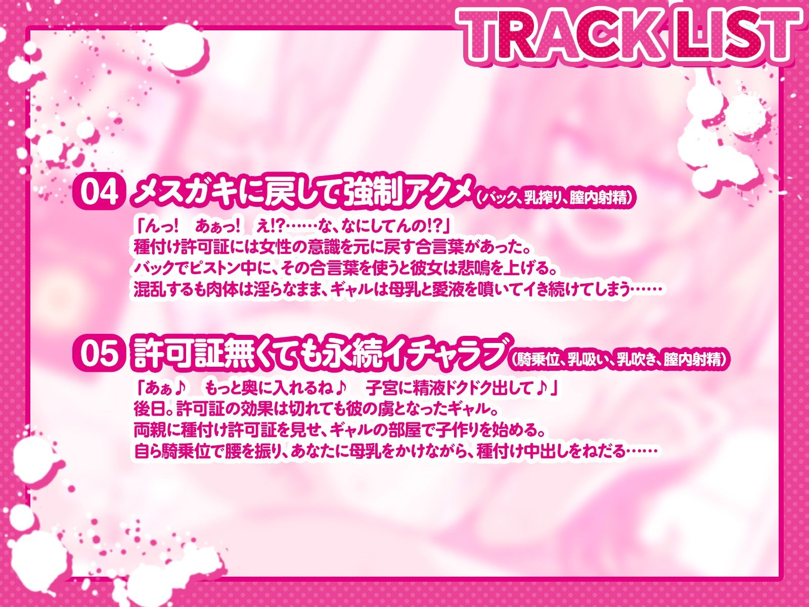ジャンル: ギャル、巨乳、中出し、母乳、搾乳、男性向け、成人向け、バイノーラル、オホ声、KU100、授乳、生意気