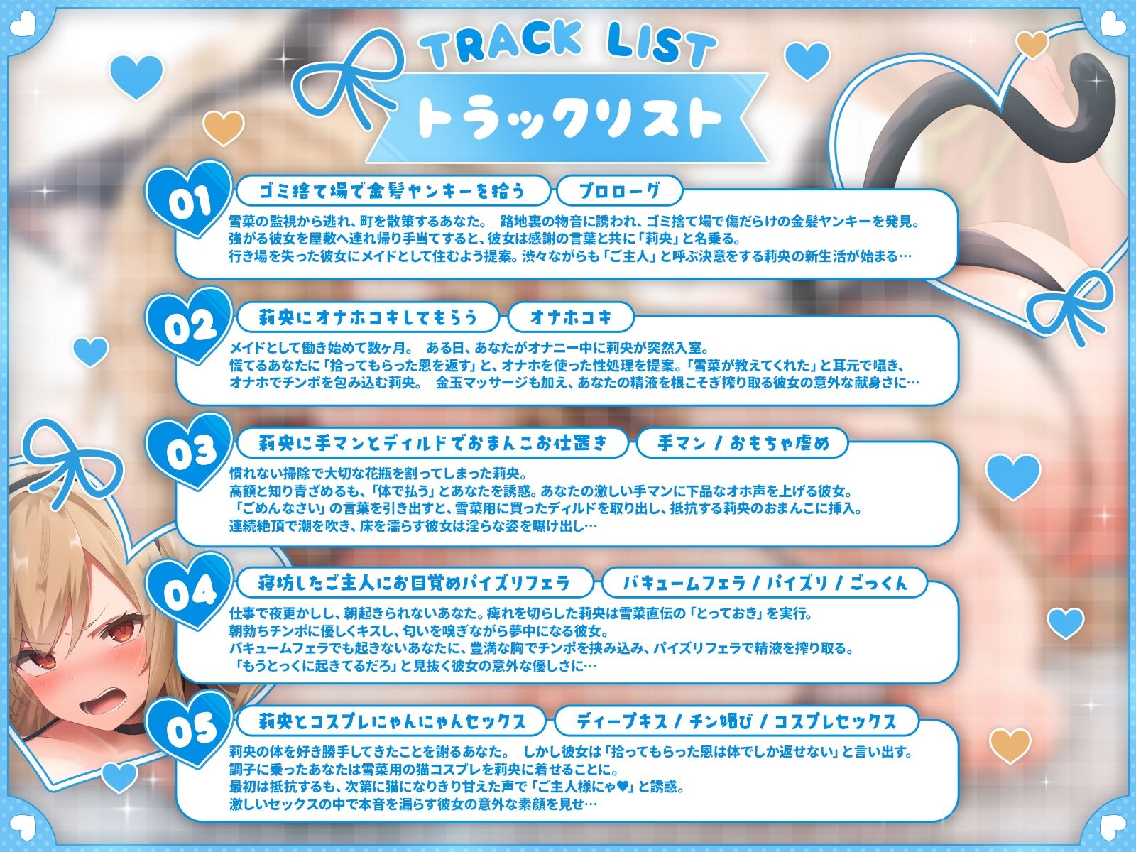 ジャンル: メイド、巨乳、コスプレ、中出し、フェラ、ラブラブ・あまあま、金髪、不良・ヤンキー、男性向け、成人向け、バイノーラル、KU100