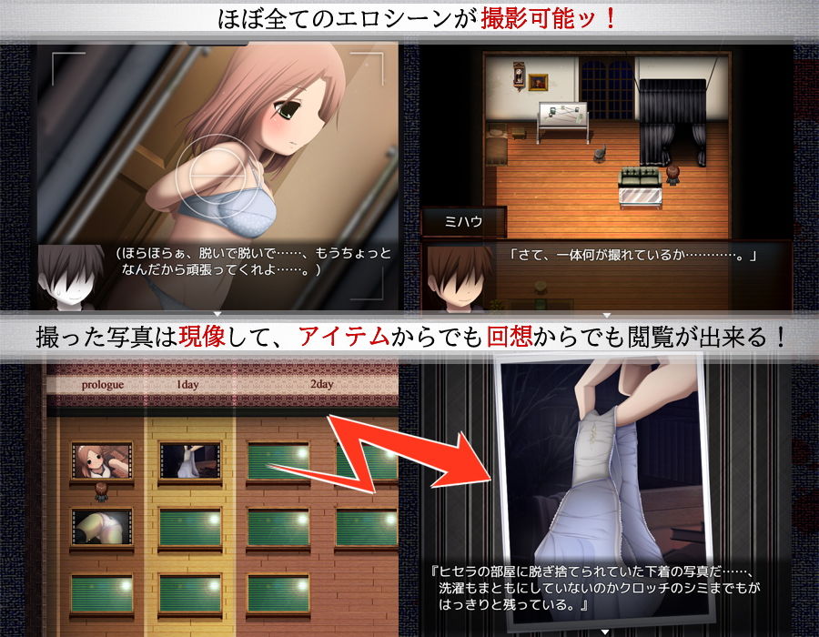 直接的な挿入のほか、カメラに拘る主人公の小さくも小ざかしい悪戯をお楽しみ頂ければと思います。