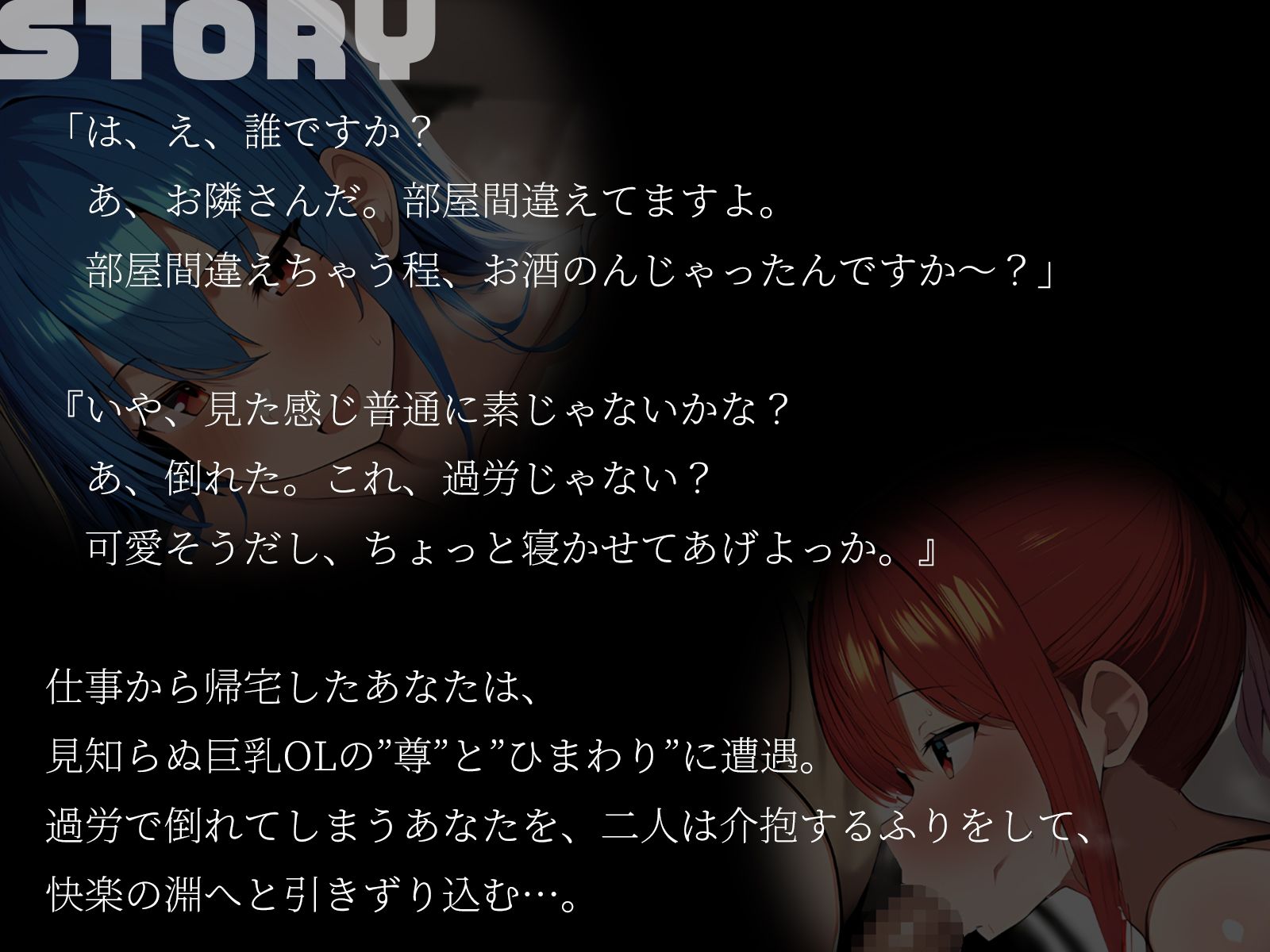 仕事から帰宅したあなたは、見知らぬ巨乳OLの’尊’と’ひまわり’に遭遇。