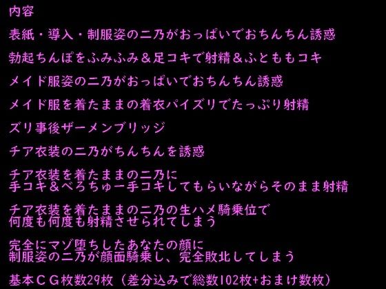 制服・メイド服・チアガール衣装の二乃の様々なエッチなテクでおちんちんを搾ってもらう描写がメインですのでご了承ください。