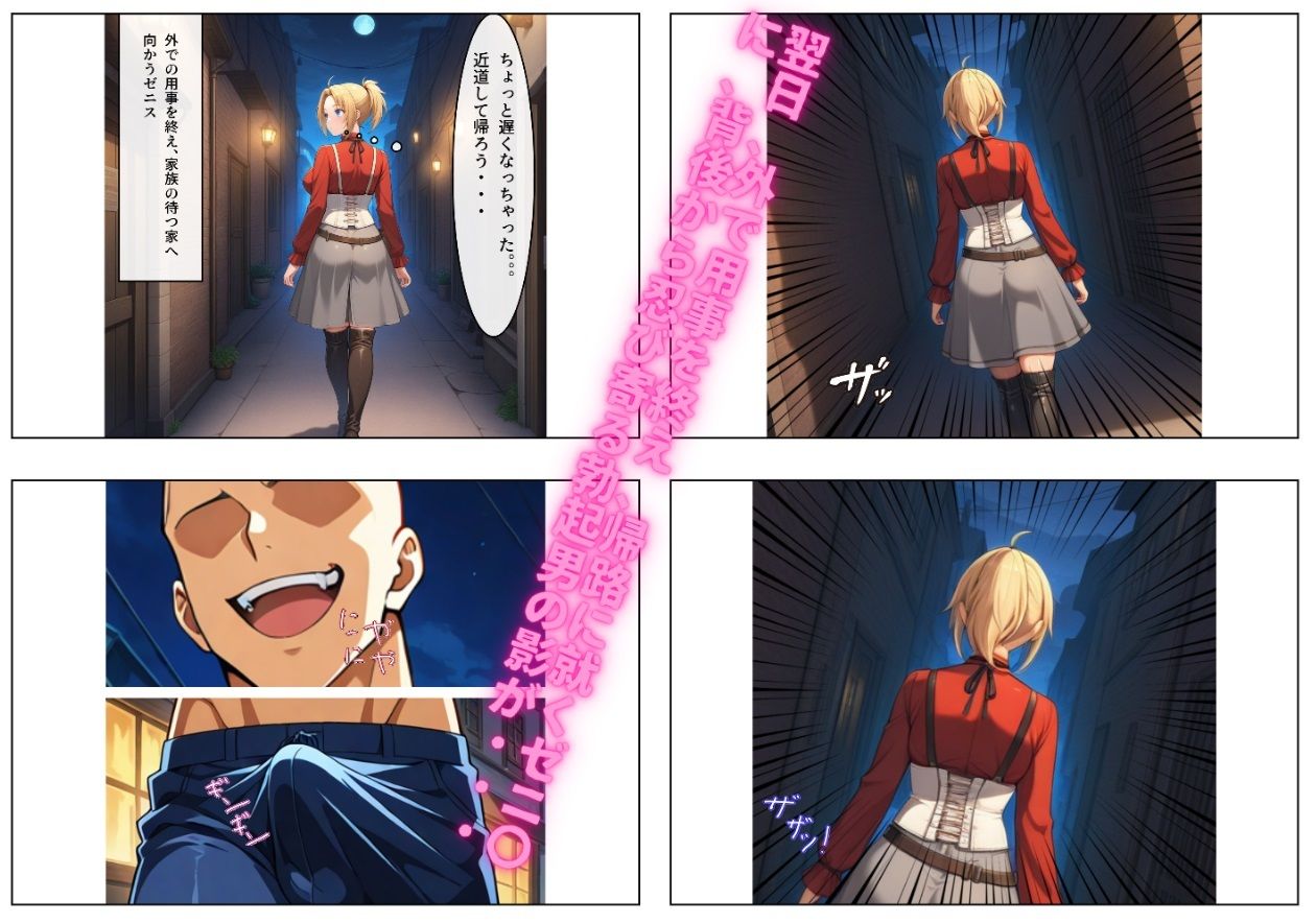 今日も外で用事を済ませ、家族の待つ家に向かうゼニスだが・・・近道するため薄暗い路地を歩いていたところ、その背後からにやついたスキンヘッドの男が迫ってきていて・・・