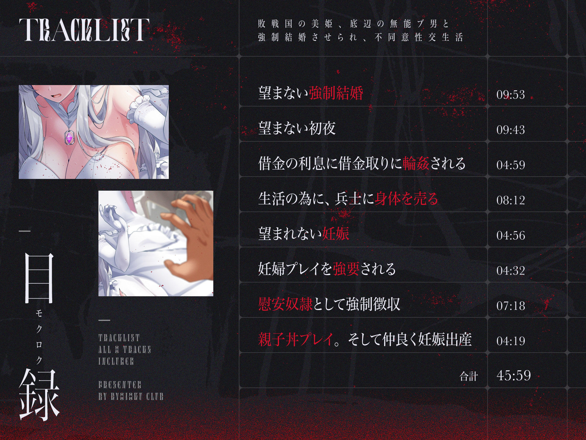 収録内容、音声データ。各種イラスト。※パッケージ差分3枚を収録、ボロボロ着衣、裸エプロン、全裸