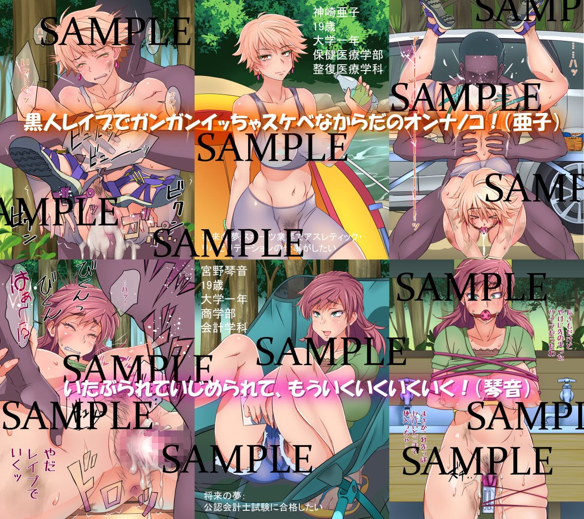 キャンプをしていた都会娘3人が新薬の実験のために、獣のような黒人たちに色々な仕方で陵●交尾されるCG集です。