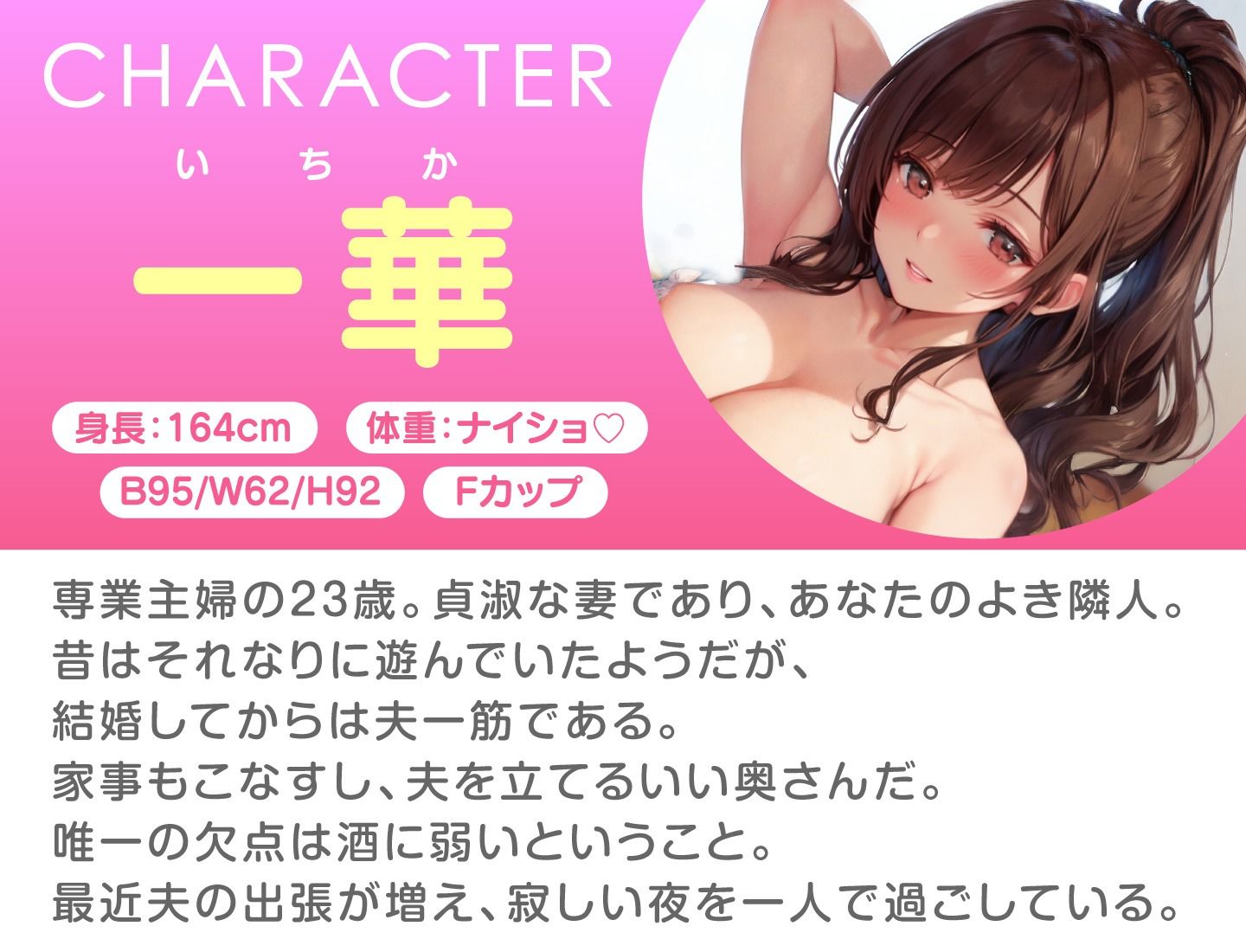 専業主婦の23歳。貞淑な妻であり、あなたのよき隣人。昔はそれなりに遊んでいたようだが、結婚してからは夫一筋である。家事もこなすし、夫を立てるいい奥さんだ。唯一の欠点は酒に弱いということ。最近夫の出張が増え、寂しい夜を一人で過ごしている。
