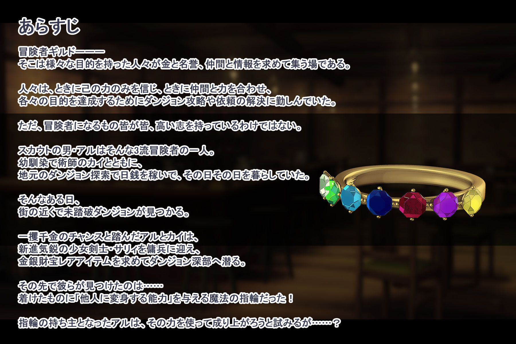 本作は、未踏破ダンジョン内で偶然「他人に変身できる指輪」を見つけた冒険者の男・アルが、