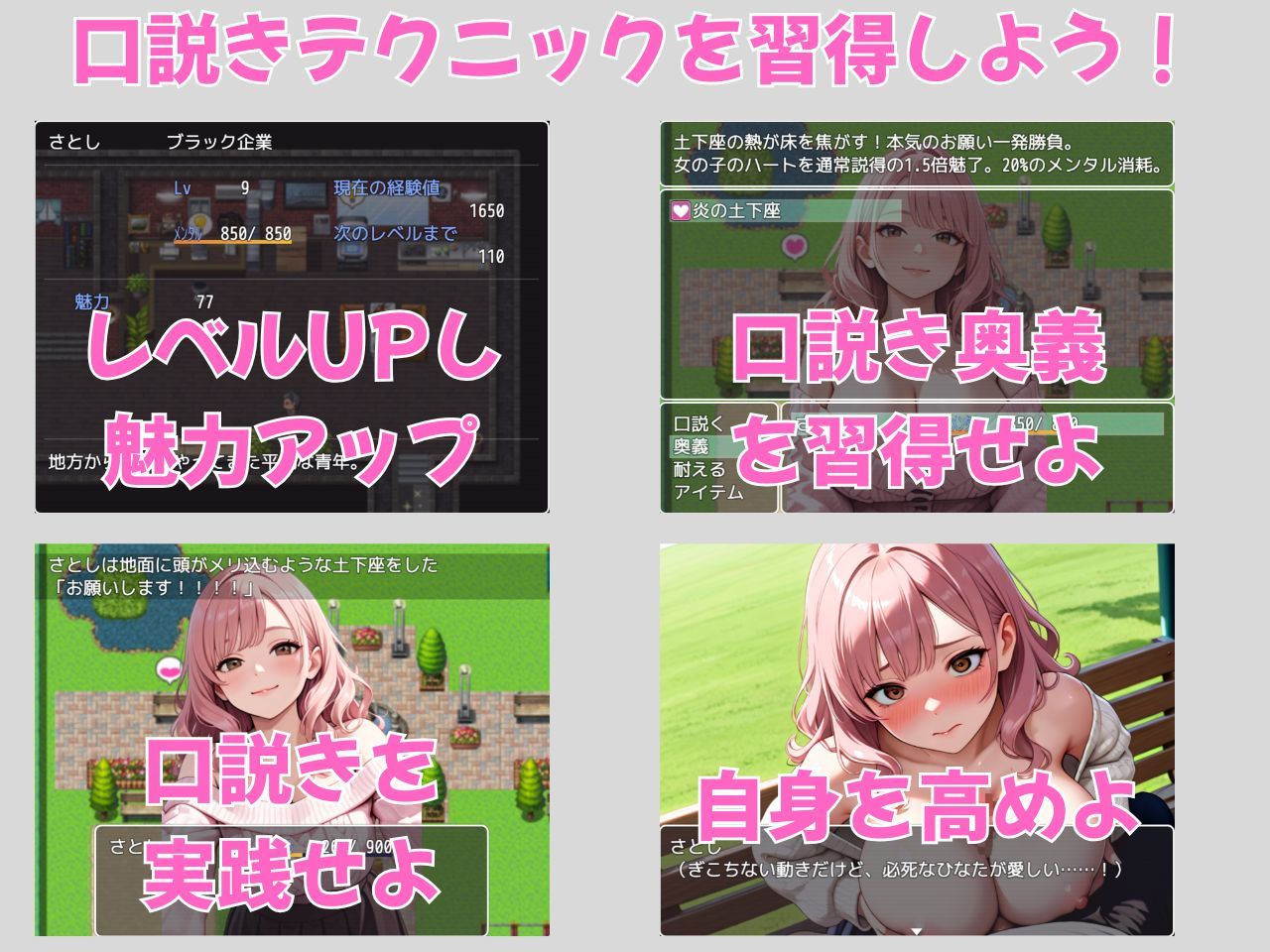 街で出会った女の子に声をかけ、口説きバトルで落とし、お願いをかける。最初は戸惑い避けていた彼女たちも、あなたの口説きが上手になれば、どんどん「お願い」を受け入れるように変化していきます。
