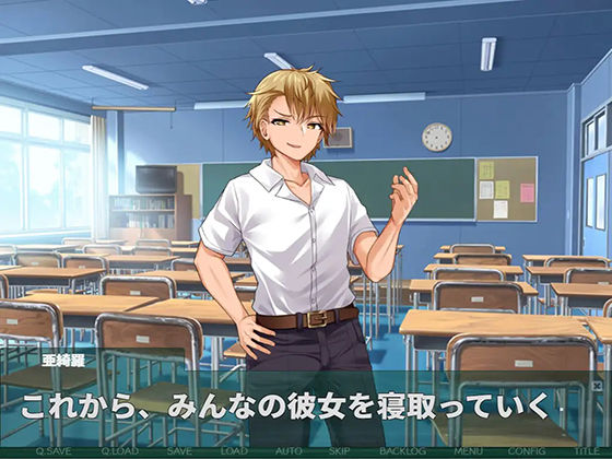 イケメン転校生は転校初日にクラスで皆の彼女を寝取る宣言、級友たちの彼女が寝取られていく中、自分の彼女は大丈夫なのか・・不安、疑問、焦燥感が・・・NTR(寝取られ)選択式アドベンチャーゲーム 最初のプレイでは真実はわからないでしょう・・疑問点や状況証拠の積み重ねにより真実が見えてくるかもしれません。