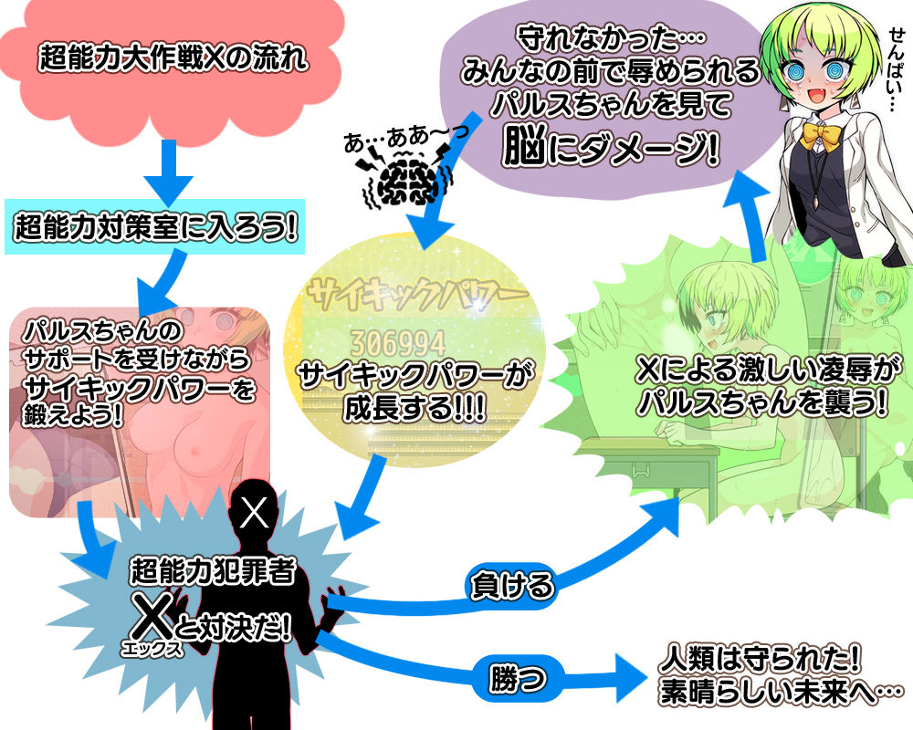 透視や念写でパルスちゃんの裸を見たり、Xにやられてひどい目にあうパルスちゃんを見たりすることで、超能力(サイキックパワー)は成長していきます。