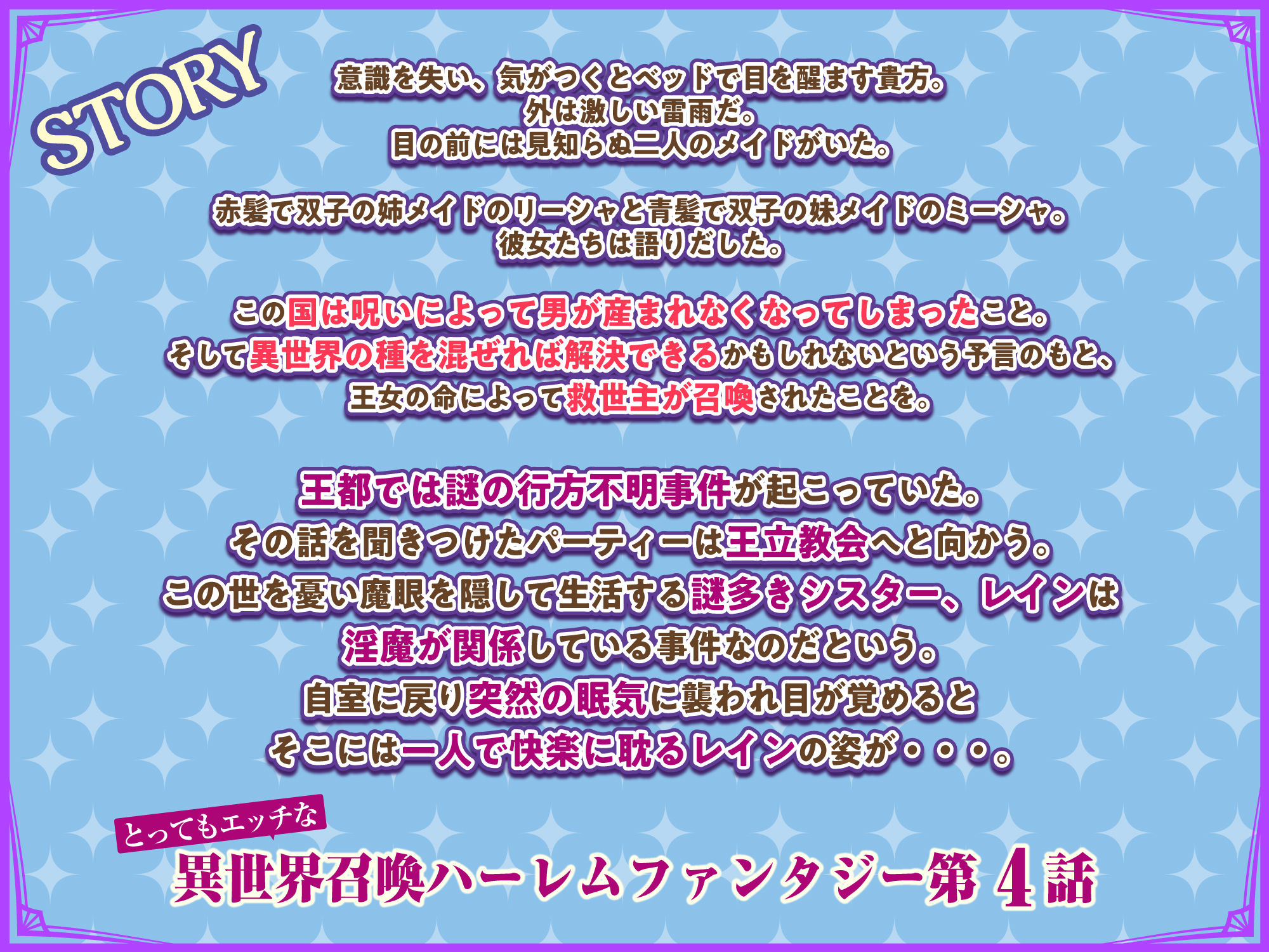 淫乱サキュバスと穢れなきシスターをパーティで籠絡して子作りハーレムエッチ〜男が産まれない異世界へ召喚された俺がヒロインを充てがわれて子作りエッチ4〜 あらすじ